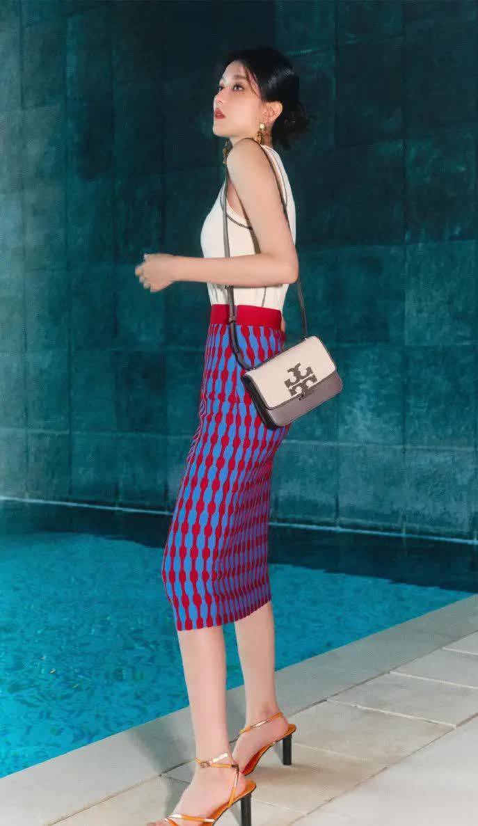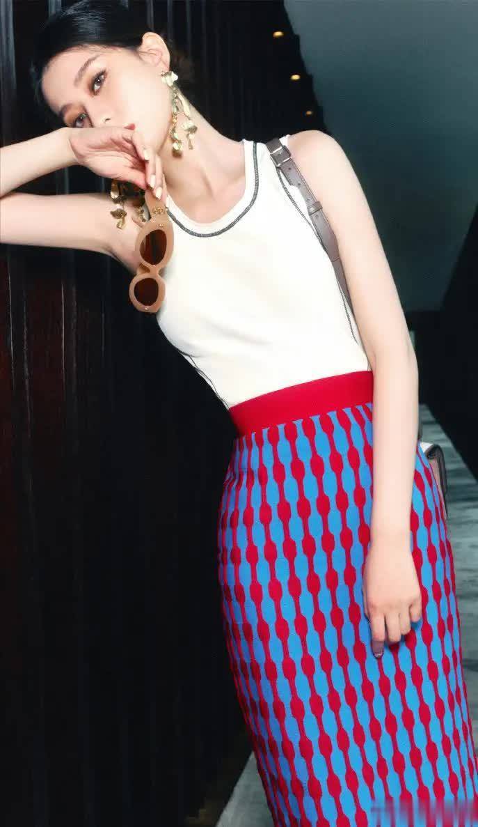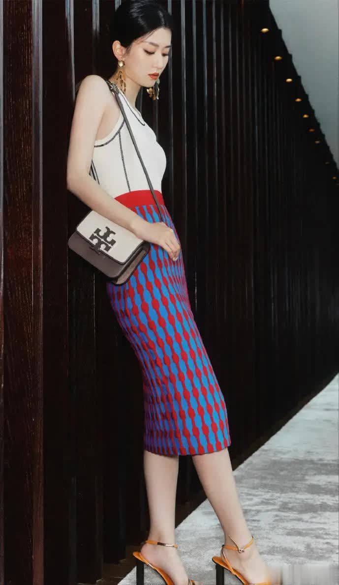 没有大面积露肤,也不靠夸张设计,乔欣却用一身“上短下长”的精致搭配,穿出了属于自己的一份从容与气场:上半身是贴身裁剪的奶油白背心,干净清爽;下半身则是蓝红交错的几何半裙,高腰设计勾勒出纤长身段;再搭配一对金属耳饰和棕调细带高跟,整套Look高级感呼之欲出。