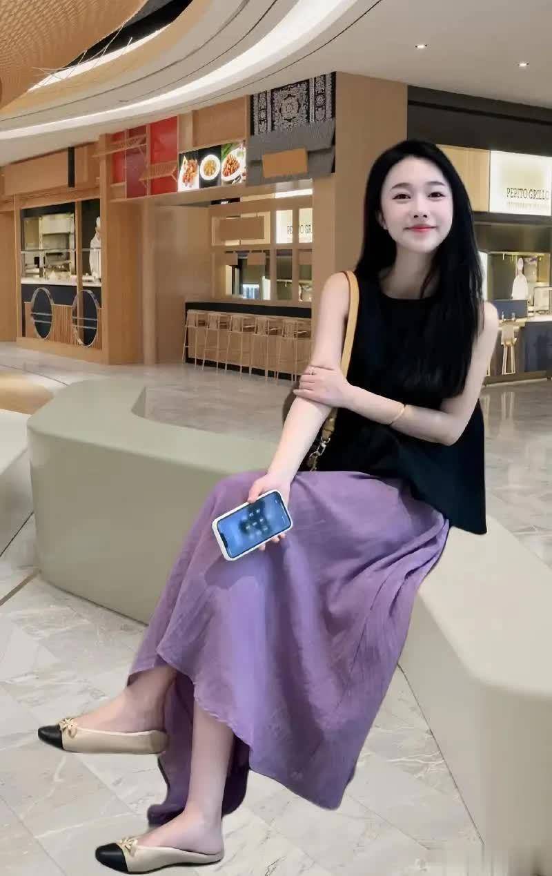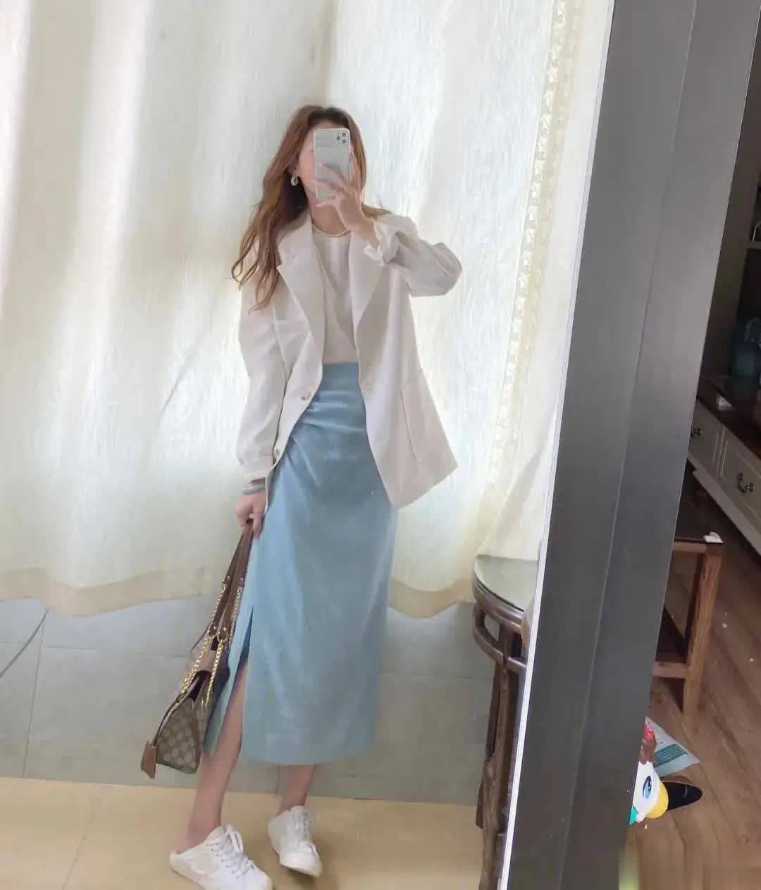 这时候,选择一件收腰或微短版的上衣搭配一条中长高腰半裙,不仅可以拉长整体比例,还能在视觉上塑造出“头小肩平腿长”的穿搭黄金线条。
