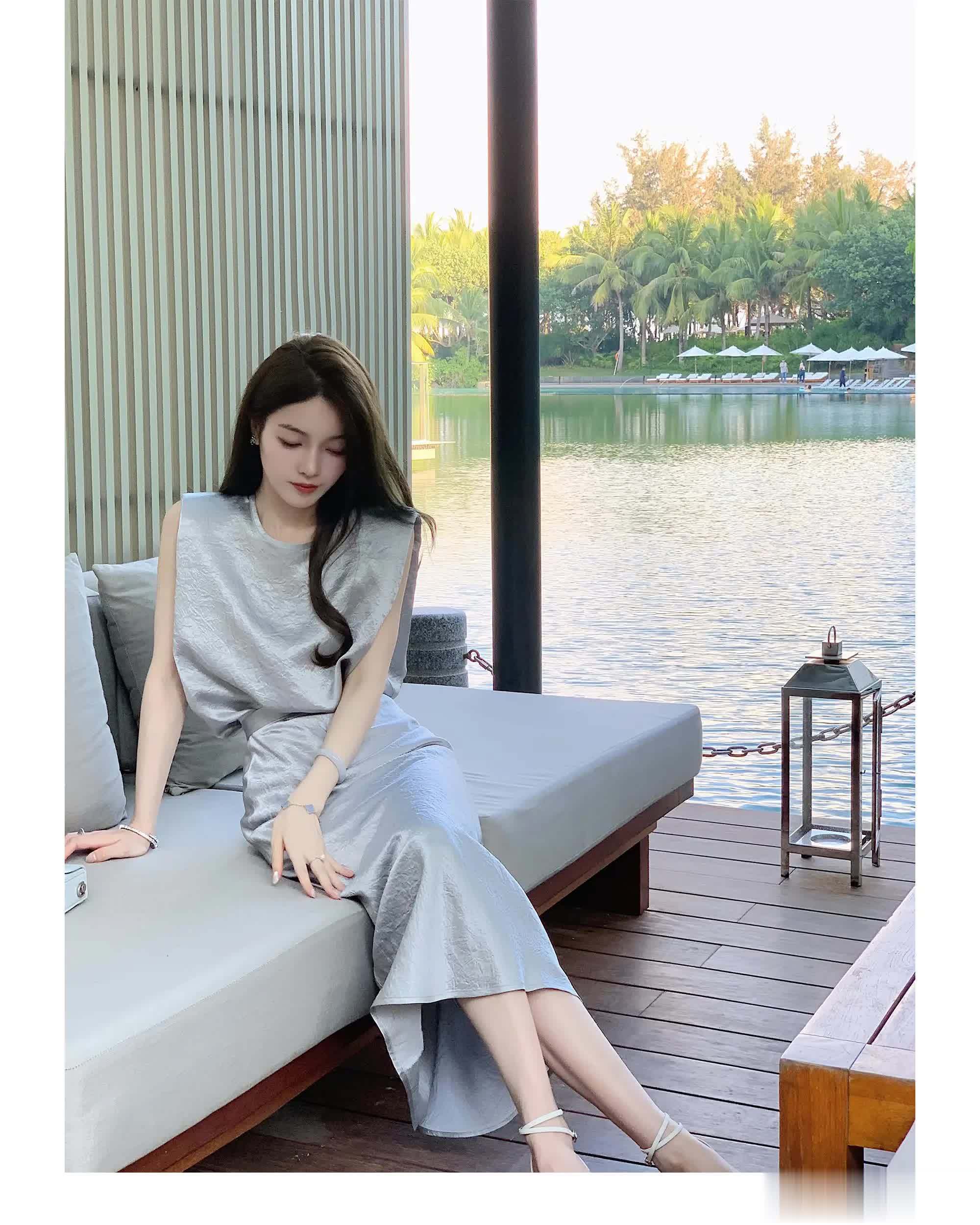 上下装比例搭配公式:无袖短上衣 + 中长半裙 = 利落又高级